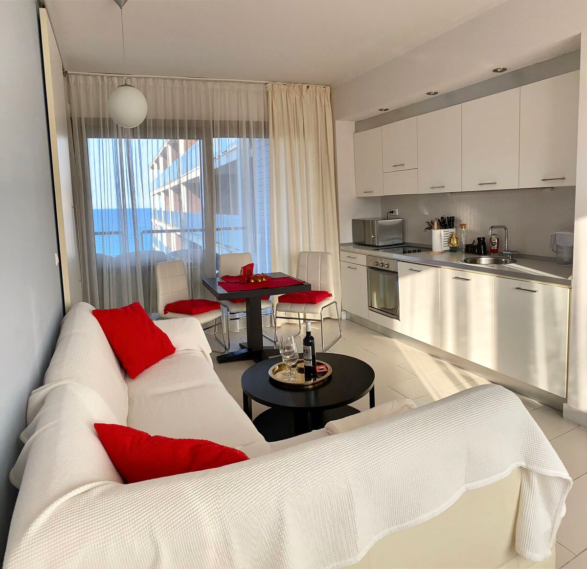エリートコンプレックスでは、素晴らしい景色のアパートメントが提供されています。壁の代わりにパノラマガラス。海に面しており、専用ビーチがあり、主要なカフェ、ショップ、2つのプールがすべて近くにあります。新しい家具と家電が揃った設備の整ったキッチン。小さなお子様用の必需品もすべて揃っています。快適なベッド、キッチン、高い天井、景色があるので、気に入るでしょう。カップル、一人旅、出張者、子連れの家族に最適です。