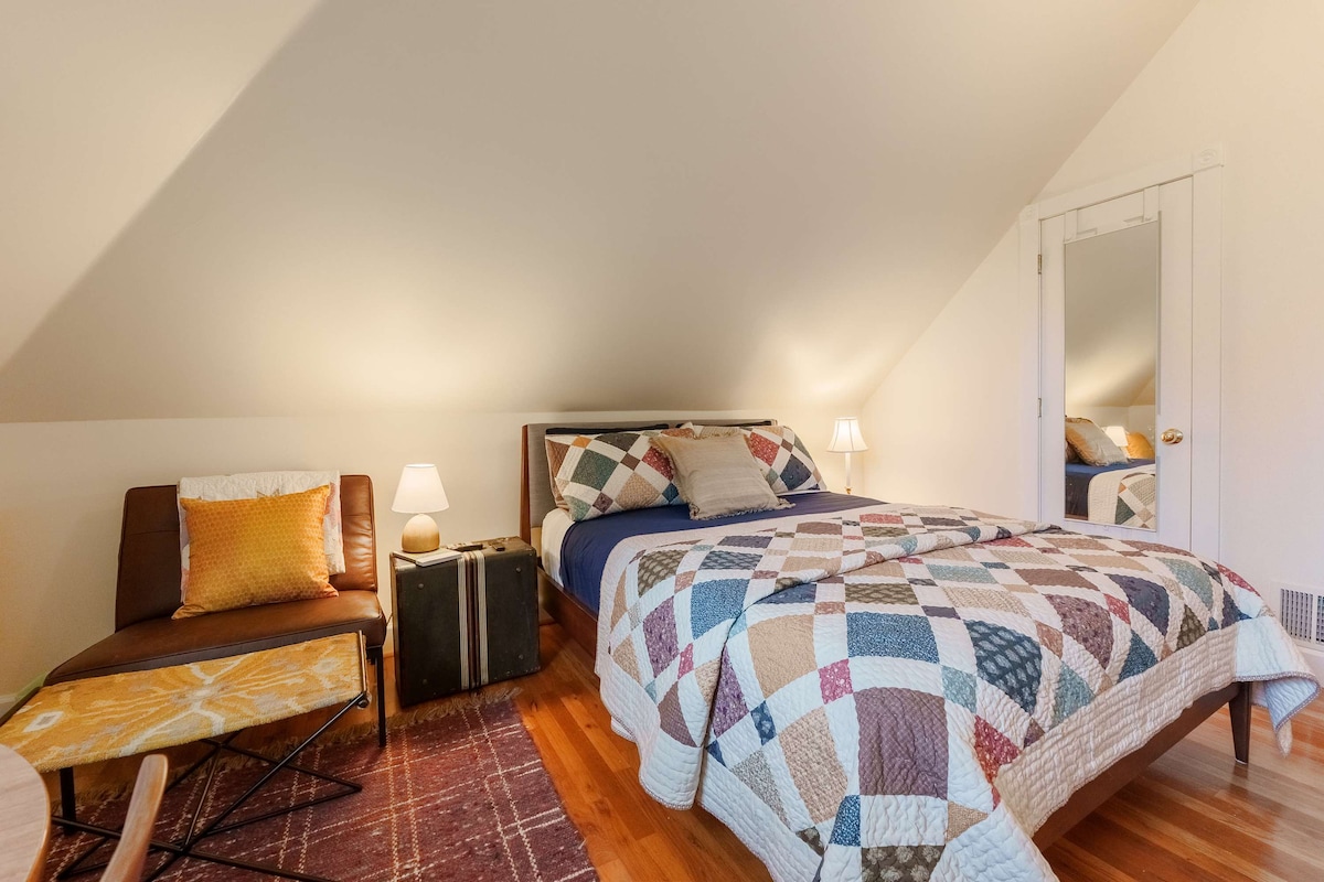 #StayInMyDistrict Charming private room and bath in the heart of Portland’s NW District. Centrally located and walkable to shops, cafes, parks, and transit. Though part of a shared home, the space is fully private with its own entry and staircase to your room. Includes queen bed, reading chair & ottoman, Streaming Smart TV, microwave, mini fridge, and in room dining table for meals or work. Central and cozy. Paid and limited street parking available. Sleeps 2. Sorry, no pets due to allergies.