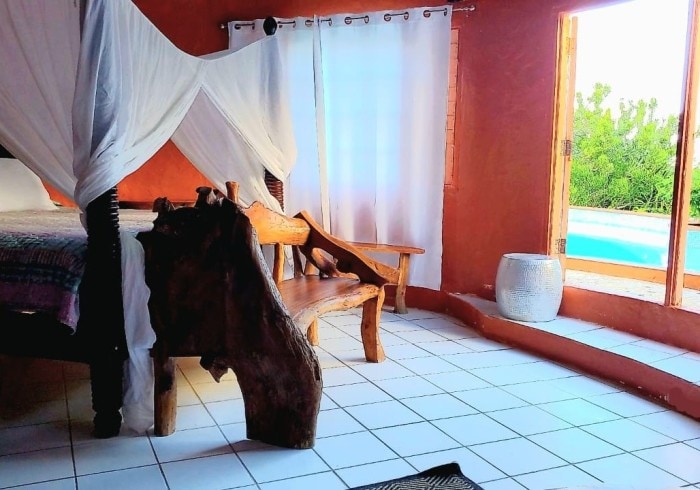 The jewel in Great Huts’ crown, this three-story stone house is an iconic suite. On the ground floor, a spacious king-sized four-poster bed creates a romantic retreat, while the upper levels feature additional king, queen, and double beds. Two bathrooms, each with tub and shower, offer extra comfort and privacy. Throughout the house, dramatic African sculptures and paintings reflect Great Huts’ African-inspired design, while large windows and open nooks overlook the lush tropical gardens.