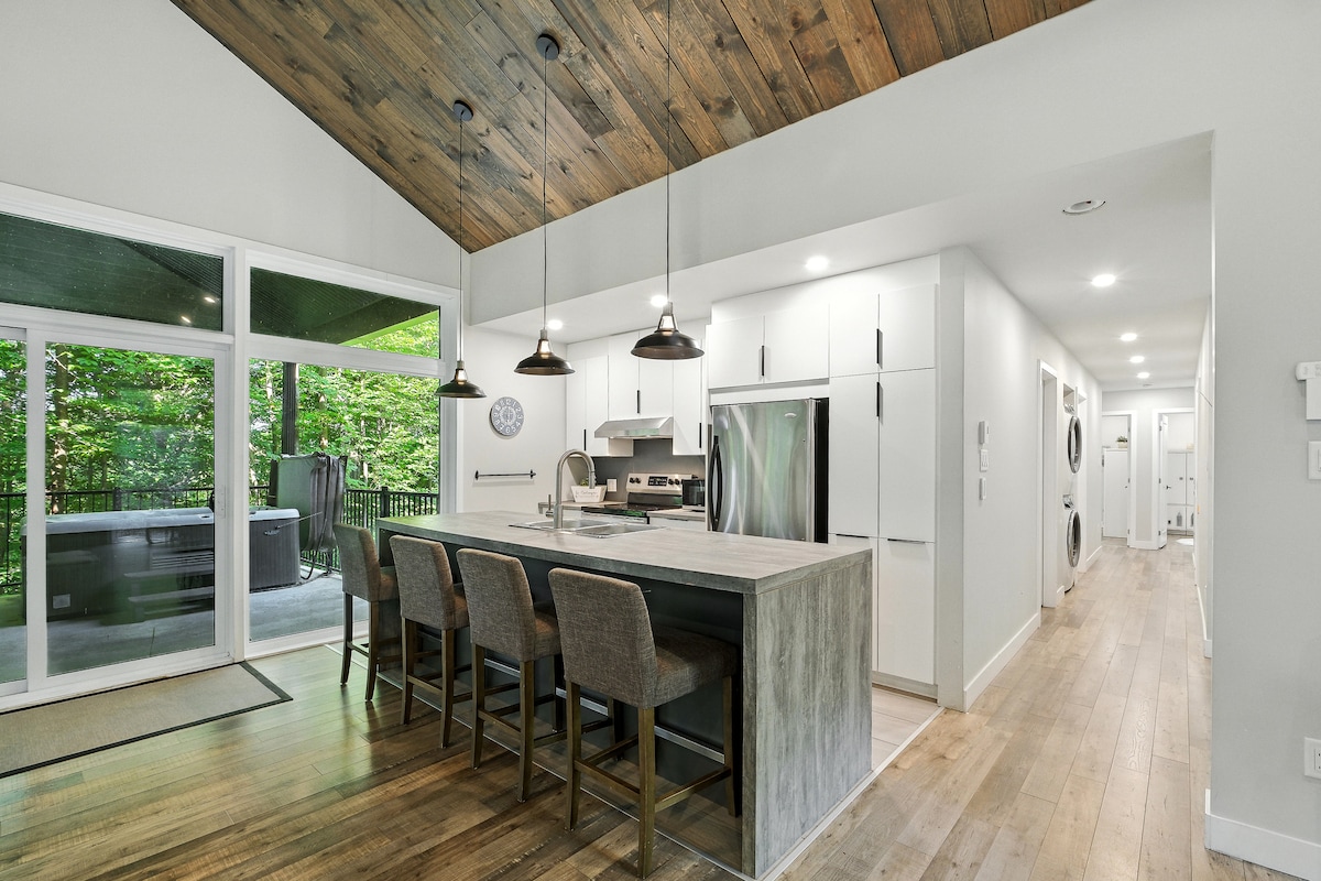Welcome to Chalet Tri Boisé, a warm, fully wood-finished chalet, perfect for a nature getaway with a private hot tub and outdoor fire pit. Accommodates up to 10 guests: • Open-concept living area with gas fireplace • Fully equipped kitchen with induction cooktop and Keurig coffee machine • Private movie room • Mezzanine with hammock-style net • Dedicated workspace • Family-friendly amenities Modern comfort and nature combined for a memorable stay in Estrie. CITQ: 308466