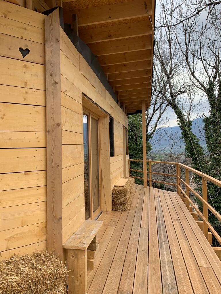 ラ・カバン・ア・パイユ:レトール高原の麓にある、新しい木と藁の柱上の家。高速道路バルセルホン出口から2km、TGV駅から4kmの場所にあります。モンブランとアルプス山脈の圧倒的な眺め。