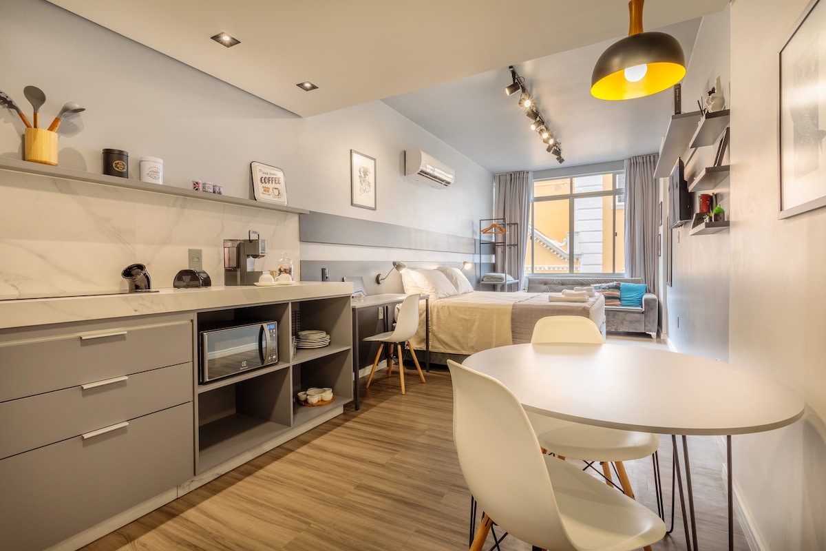 フロリアノーポリスの中心部にあるあなたの隠れ家! 1ベッドルームのスタジオは、完全に改装され、お客様の快適さを考慮して設計されています。エアコン、設備の整ったキッチン、心地よいインテリア。 細部にまでこだわったお部屋で、リラックスしてくつろげます。 ロケーションは完璧です。魅力的なプラザXVとセントロスル・イベントセンターからわずか数歩です。市場、バー、レストランなど、中心街の魅力をすべて楽しめます。 *建物内にガレージはありませんが、近くの通りや駐車場に駐車スペースがあります*
