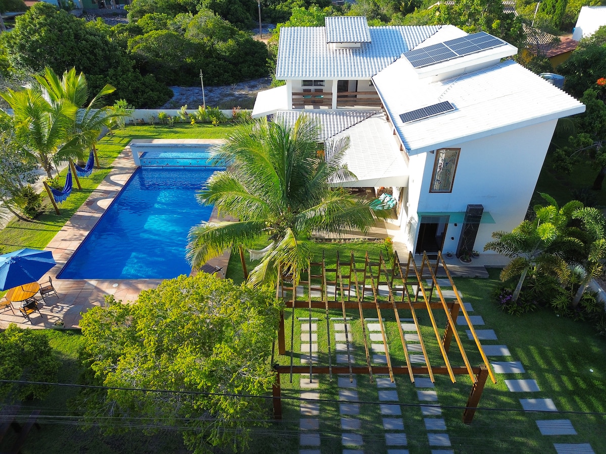 Relaxe e divirta-se com toda a família neste lugar. Mar a 3 min de casa a pé (300m) e ainda uma piscina particular! Diferente de outros locais na região, esta casa oferece privacidade com a área gourmet e a piscina de uso exclusivo para você e seus familiares. A rua é a melhor do condomínio, com acesso à primeira passarela para a praia, parquinho infantil com tirolesa e muita tranquilidade. Os quartos possuem ar condicionado, além de ótimas camas (uma king e outra queen size).