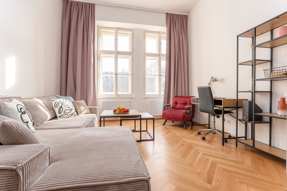 カーリンのシックなワンルームでスタイリッシュに過ごしましょう! 街を1日探索した後は、飲み物を片手に穏やかなバルコニーでくつろぎましょう。 充実したキッチンから、仕事やエンターテイメントのための高速インターネット、さらには洗濯乾燥機まで、快適な滞在のための設備が完備されています。 さらにうれしいことに、 建物のガレージに駐車場がありますので、スポットを探す心配はありません。 カーリンの中心部で本物のプラハの生活を体験しに来てください!