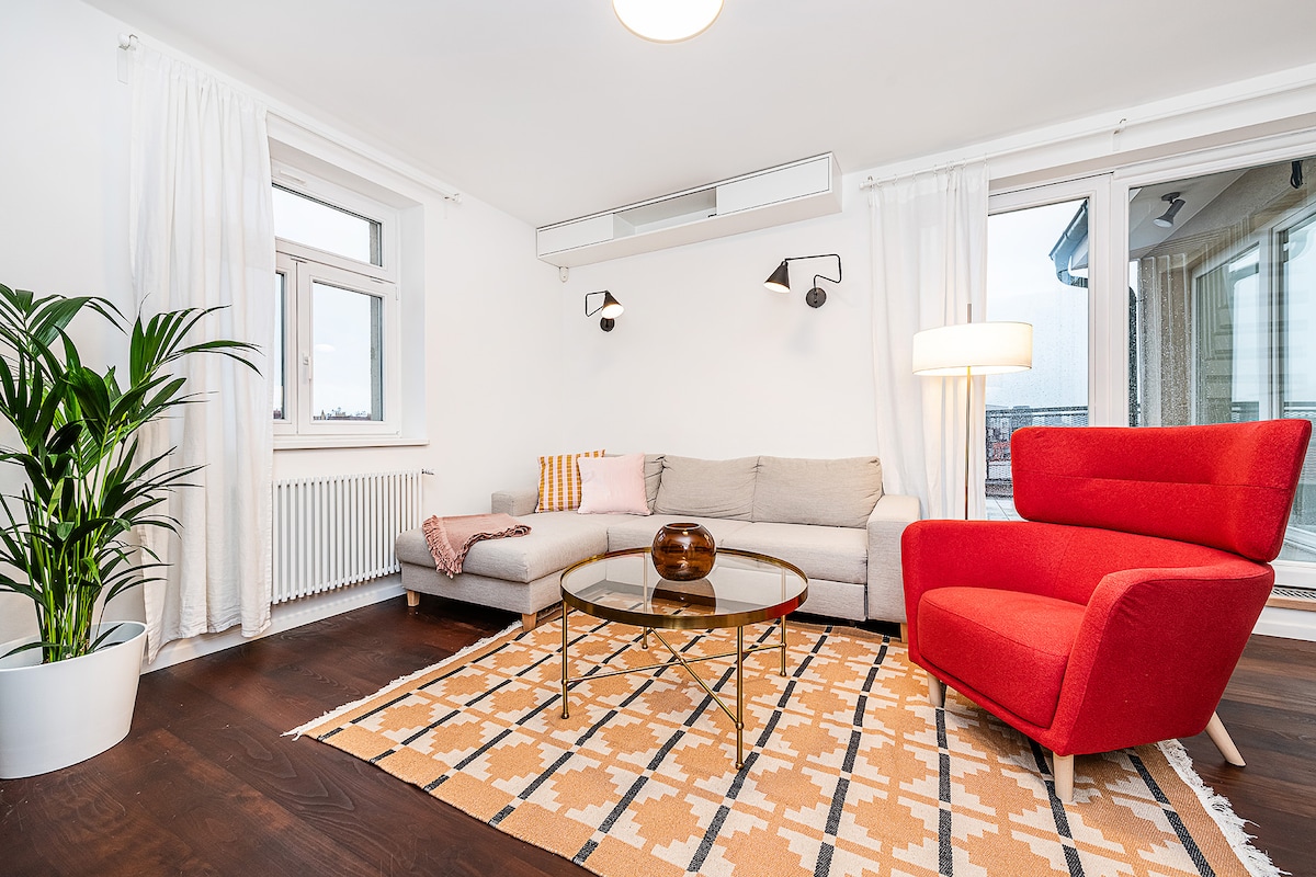 *プラハ中心部のトップロケーション *素晴らしい景色を望む専用テラス *大きな窓のある2階建てのサニーアティックアパートメント *2022年に新築・内装済み *家の近くに駐車場あり *家のすぐ近くに路面電車の停留所があります *エアコン *エレベーター お友達と忘れられないひとときを過ごしたり、プラハの歴史的な街並みと王室都市プラハの最も象徴的な観光スポットを一望できる専用テラスでくつろいだりできます。 アパートはバー、カフェ、レストラン、食料品店に囲まれています。