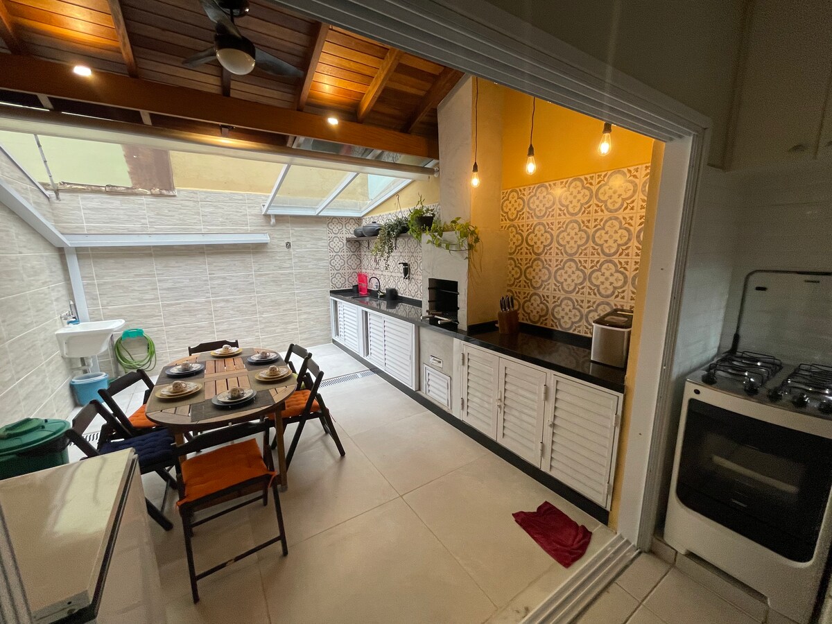 Condomínio familiar, a 450m da praia de Camburizinho, tranquilo, arborizado, com piscina adulto e infantil(foto da capa do anúncio) hidromassagem, sauna e sala de jogos, monitorado 24 horas por câmeras de segurança. Casa aconchegante,três suítes, (uma no térreo) , muito bem equipada, estacionamento na frente da casa(duas vagas),comporta até 6 pessoas incluindo crianças, destacando-se por seu espaço externo com jardim,rede, churrasqueira, balcão e cooktop para aproveitar em família e amigos.