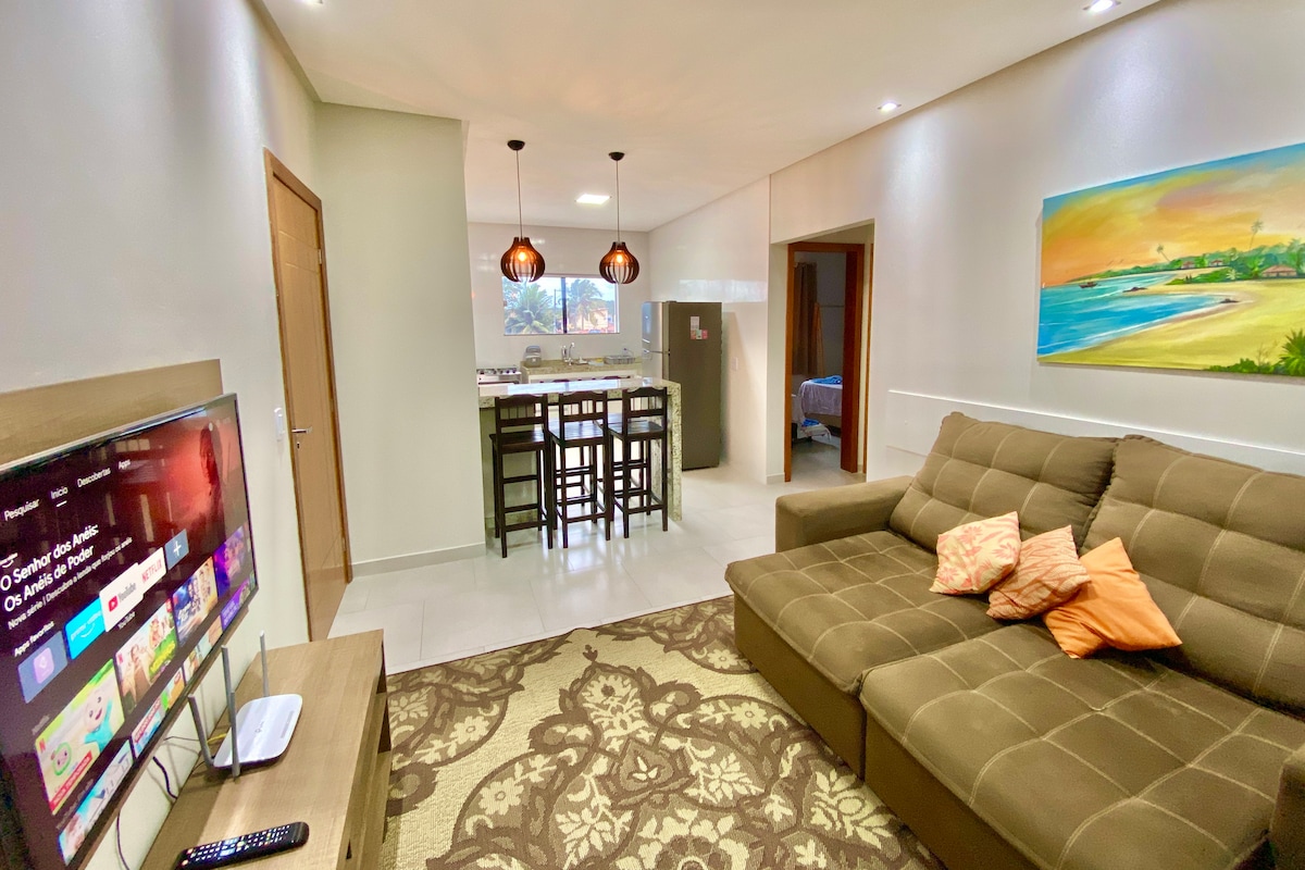 LEIA TODA A DESCRIÇÃO ANTES DE RESERVAR! Todos os dias te passarei sugestões de praias e lugares para conhecer, incluindo passeios. Apartamento 20, no 2º andar, confortável e completo, em condomínio a 50 metros da praia. Wi-Fi 5G de 450 Mbps. Suíte com cama de casal, sofá, TV e banheiro privativo; quarto com cama de casal, solteiro e auxiliar, ambos com ar-condicionado. Sala com sofá reclinável e TV 50". Cozinha completa. Roupas de cama inclusas. Máquina de lavar, ferro e secador disponíveis.