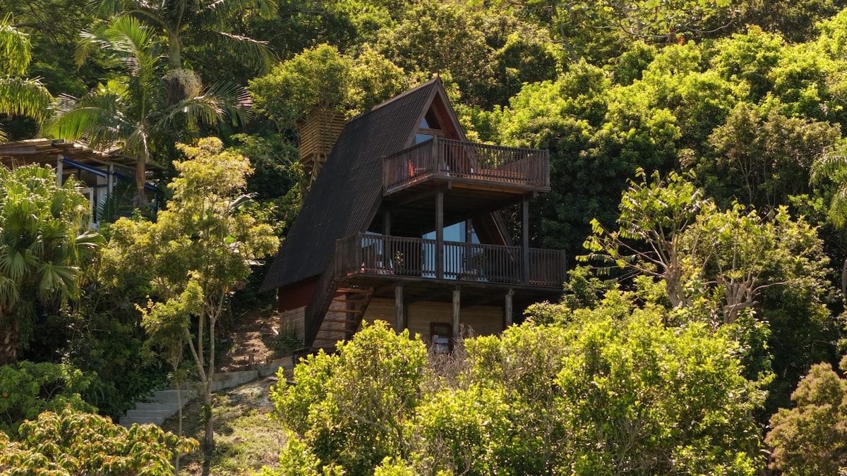 Chalezinho na montanha com vista para o mar
