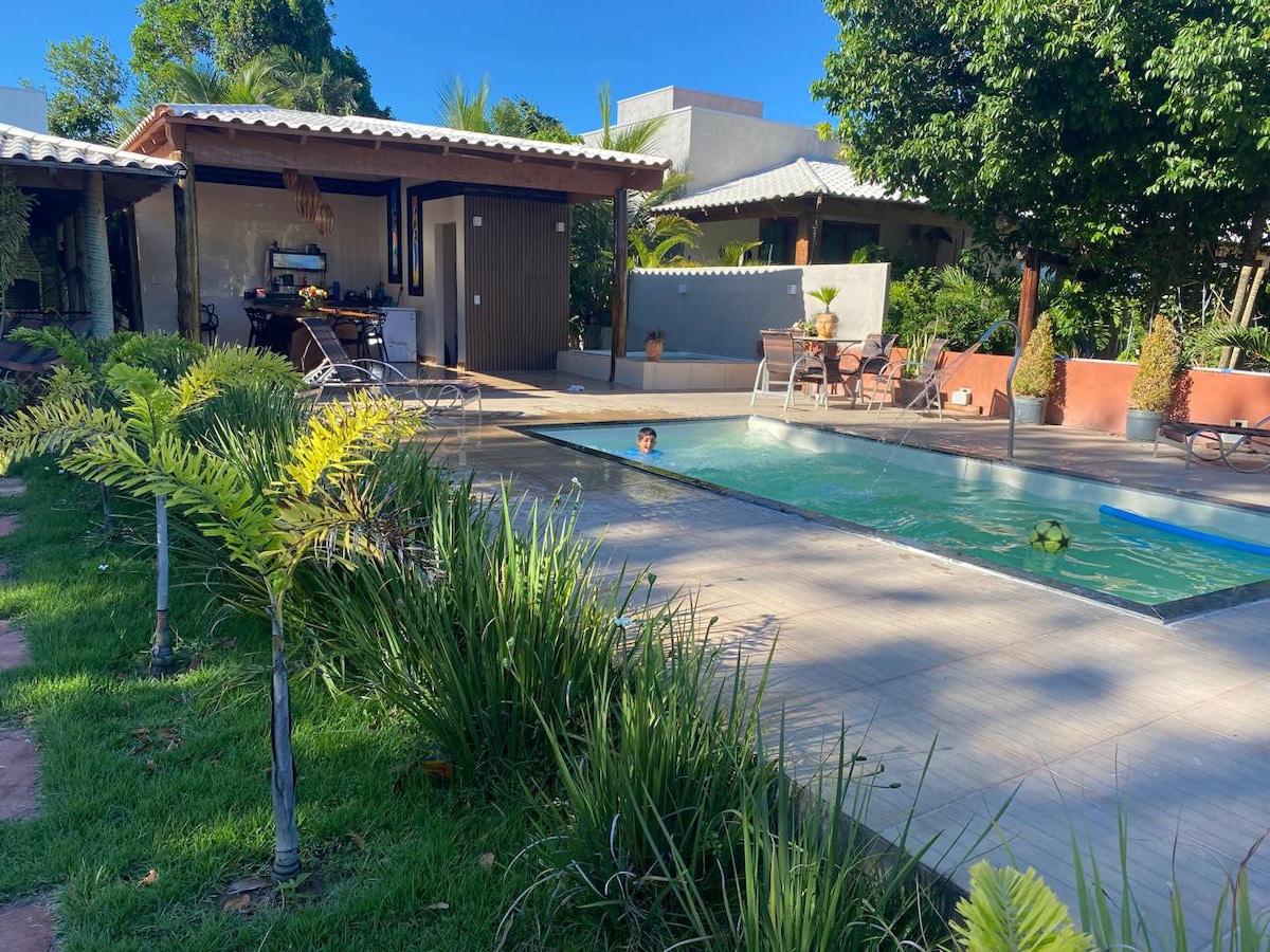 ブラジル、プラド、グアラチバビーチの「ペ・ナ・アレイア」コンドミニアムにある、ビーチから2番目の家。 + 専用プール2つ(大人用と子供用) + 8m x 16mの芝生のあるグラウンド、ハンモック付き + 寝室7室(スイートルーム3室、セミスイートルーム2室、寝室/リビングルーム2室)。 + すべての客室にエアコン + 400MbpsのWi-Fi + 温度調節可能なシャワー +スマートテレビ +グルメキッチン + バーベキュー + 3台分の駐車スペース + 鳥やナマケモノが定期的に訪れます!