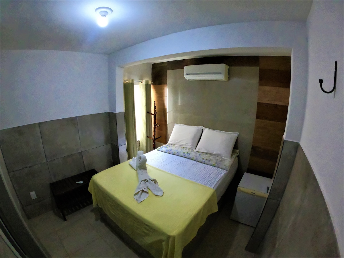 Cada suíte oferece: cama de casal confortável, mesa de apoio para trabalho ou refeições, e ventilador com funcionamento contínuo para noites confortáveis e frescas.
