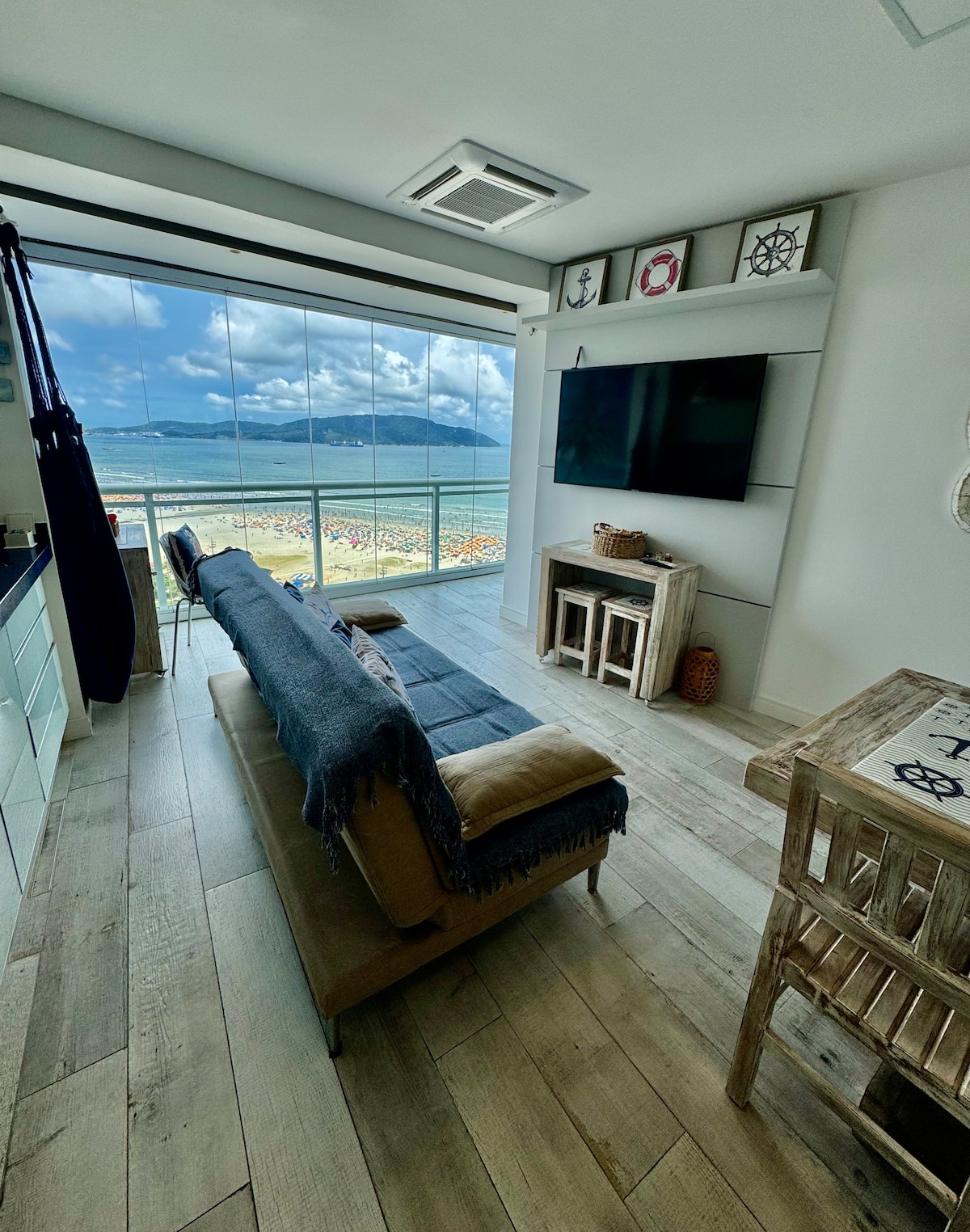 BEACHFRONT Studio in José Menino, Santos, SP. SIDE SEA VIEW. HANGING BED. CLIMBING WALL. Comfortably accommodates 2 adults (queen-size bed) and 2 children (double-size bed). :. 350-megabyte Wi-Fi :. Hot/cold air conditioning :. 32-inch Smart TV :. Electronic lock :. Kitchen (filter, refrigerator, cooktop, microwave, Nespresso machine, mixer, and pots) :. Washer/dryer :. Window screen :. Outlet protectors :. 220V voltage :. Rotating parking space, subject to availability.