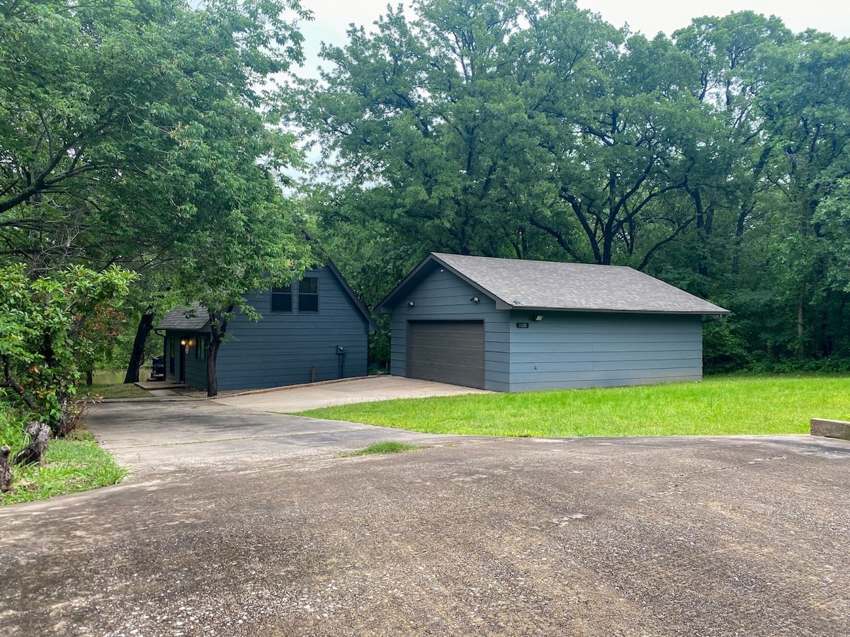 Modern farm house meets lake house chic under a canopy of mature trees at Lake Texoma. Nice beach is 5 min walk away, & boat ramp 2 min drive away. This home has amazing amenities for everyone including gourmet kitchen, detached gameroom, horseshoe pits, & other fun outdoor activities. It has covered outdoor deck with BBQ grill, sink, picnic table, chairs, also lounge chairs. House has puzzle table and is stocked with games, art supplies. Perfect place for a getaway with friends & family.