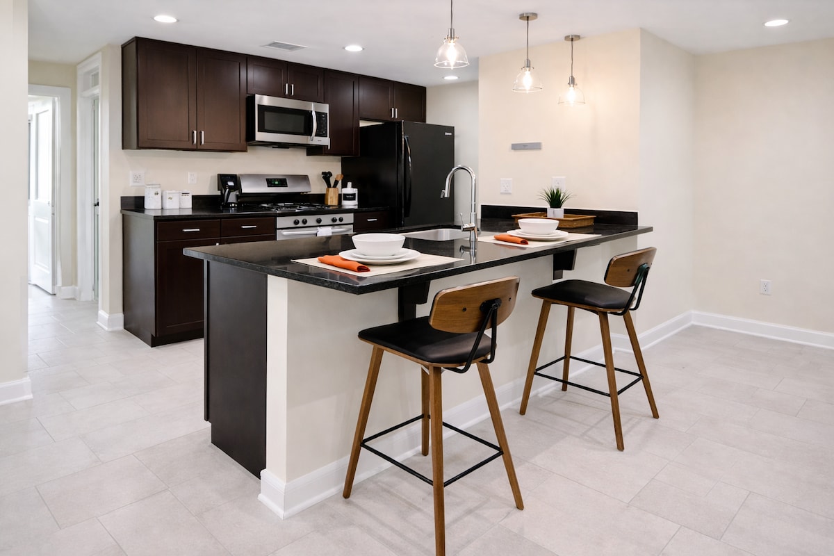 288平方フィート、専用玄関付きの母親向けスイート/スタジオアパートメント、フルサイズベッド、スリーパーソファ、折りたたみ式シングルベッド、フルキッチン、小さなシャワールーム付きバスルーム、65インチのスマートテレビ(ケーブル放送、Netflix、Wi-Fi完備)。 12歳未満のゲストはご同伴いただけません。 立地:フォート・ミード(14.4マイル)、アナポリス(15マイル)、アンドリュース空軍基地(19マイル)、ワシントンD.C.(19マイル)、ボルチモア(29マイル) 近隣の空港:ロナルド・レーガン・ワシントン・ナショナル空港(DCA、23マイル)、ボルチモア・ワシントン国際空港(BWI、27マイル)、デュール国際空港(IAD、48マイル) 公共交通機関:メトロバス停(0.2マイル)、ニューキャロルトン駅(メトロレール、アムトラック、グレイハウンド)(9マイル)