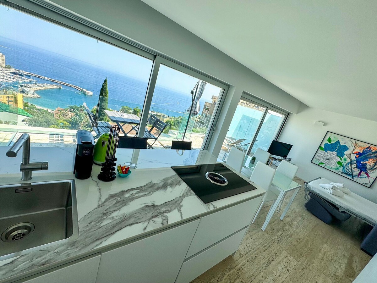 Appartement luxueux, très calme avec une vue mer panoramique époustouflante et une place de parking privée au sein de la résidence en extérieur. Un havre de paix situé à 5 minutes en voiture de Monaco, 12 minutes à pied de la plage du Golfe Bleu et de la gare de train (accès escaliers) Très lumineux avec de grandes baies vitrées, balcons, cuisine américaine toute équipée, Wifi internet haut débit, grand écran TV dans salon et chambre, douche moderne à l'italienne, climatisation.
