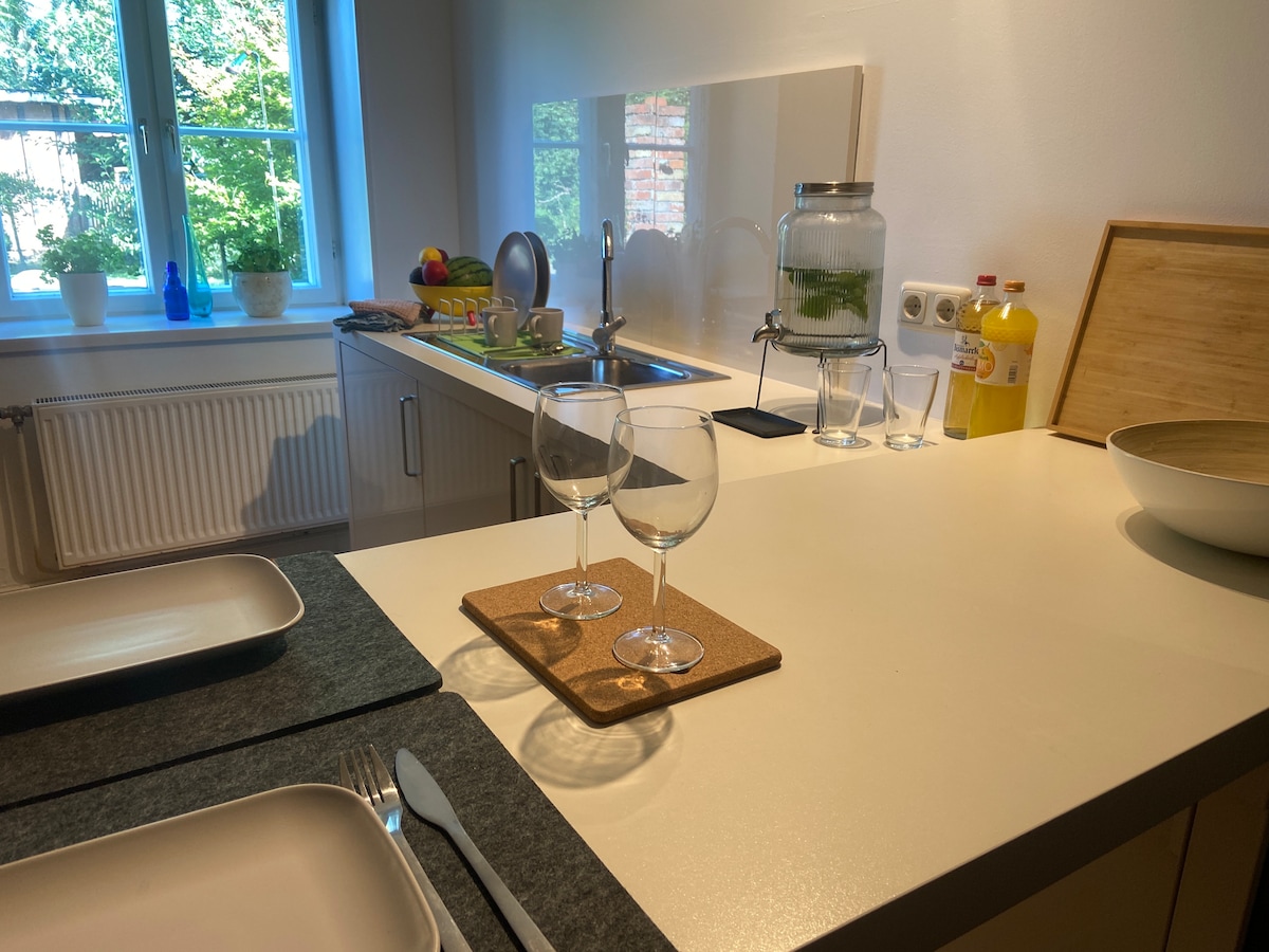 私たちのフレンドリーで明るく装飾されたアパートメントは、農業に特化した私たちの農場の真ん中にある別館にあります。モダンで設備の整ったキッチンと、一緒に料理をしたり、贅沢な朝食を楽しんだりできるカウンターを備えたリビング・ダイニングエリアで構成されています。リビングルームのソファは追加のソファベッドです。一緒に過ごす快適な夜のために、暖炉が用意されています。バスルームにはシャワーがあり、洗濯機もあります。