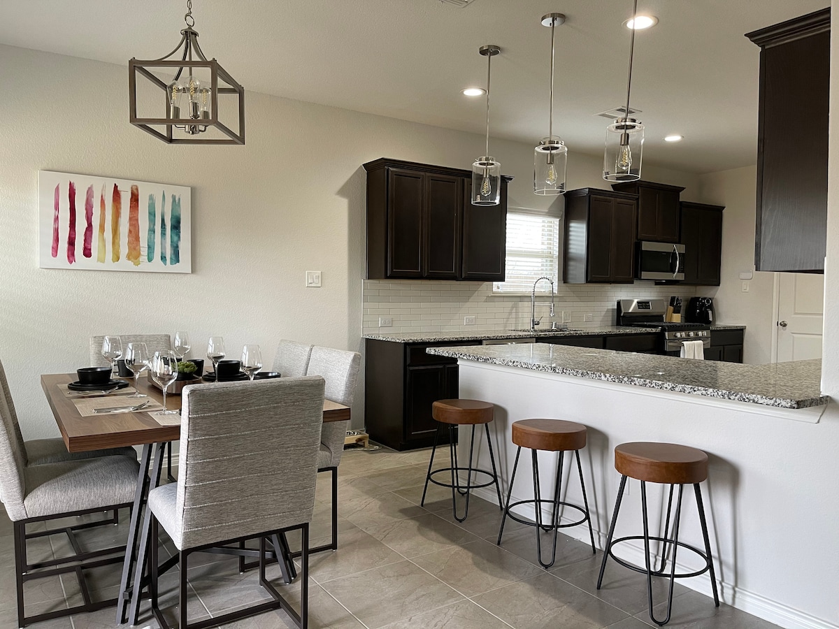 Welcome to your perfect getaway at Prosper! This stylish and comfortable 3-bedroom, 2-bath home offers a well-designed space ideal for families or groups. Enjoy an open layout, cozy living room with fireplace, fully equipped kitchen, and a fun game room with pool, ping pong, and air hockey. Step outside to a private backyard oasis with a sparkling pool. Located on a quiet cul-de-sac near shops, dining, and highways. Comfort, fun, and convenience for your next memorable stay!