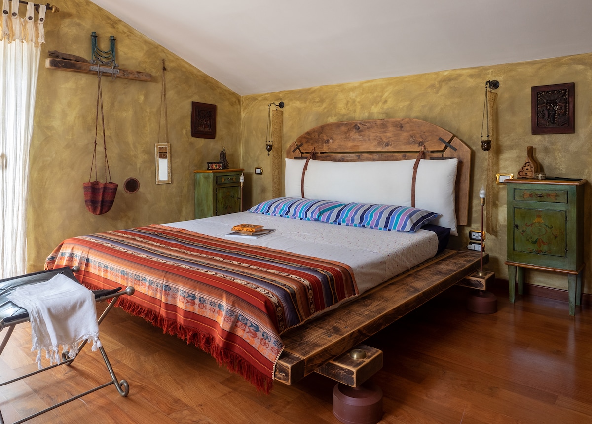 Suite matrimoniale "Minerva" – Una camera raffinata con letto king size per il massimo comfort, dotata di bagno en-suite con doccia, per un soggiorno all'insegna del relax. Possibilità di aggiunta letto singolo vista la spaziosità della suite. Vista sulla vallata , sulle montagne dei monti gemelli e sul parco secolare della villa.