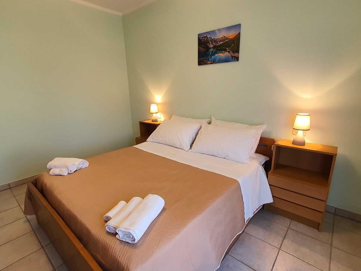 玄関の前に6段階の階段があるアパートメント。モダンで、最近全面改装されたばかりです。明るいリビングルームには、43インチスマートテレビ(Netflix)と専用Wi-Fiが備わっています。バルコニーと湖と山の素晴らしい眺め、ソファーベッド1台。バスタブ、ビデ、洗濯機付きバスルーム。コーヒーメーカー、冷蔵庫と冷凍庫、オーブン、電子レンジ、鍋、食器、カトラリーを完備したキッチン。 ベビーベッドを収納できる寝室、大きなクローゼット付き。