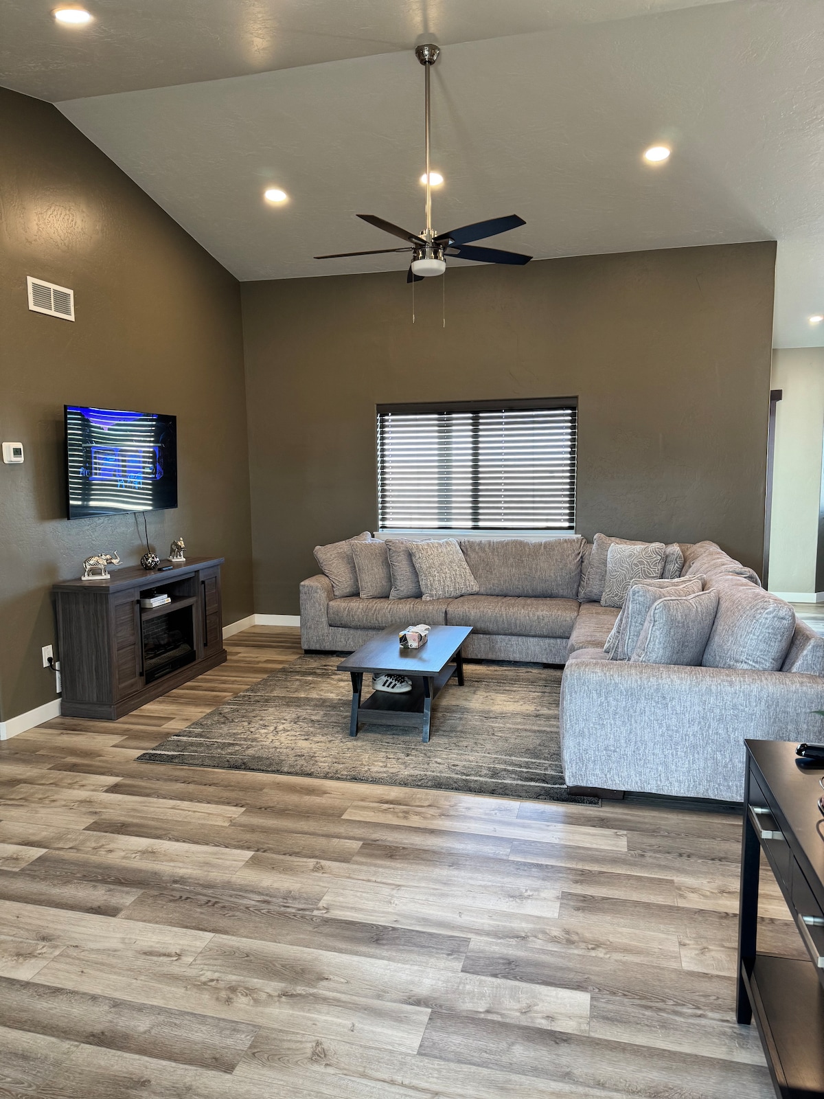 Spacious 4-bedroom home in a quiet cul-de-sac near CSU Pueblo, golf, & shopping. This Spanish-style house features Western art, large private backyard with sport court for pickleball & basketball, firepit, grill, patio, yard games. Inside: 17' ceilings, 85” 4K TV, leather sectional, double ovens, Keurig, fast Wi-Fi, & full laundry. Master suite with king bed, walk-in closet, jet tub, & shower. Office with oak desk & 34” screen for remote work. Great for families, couples, or groups