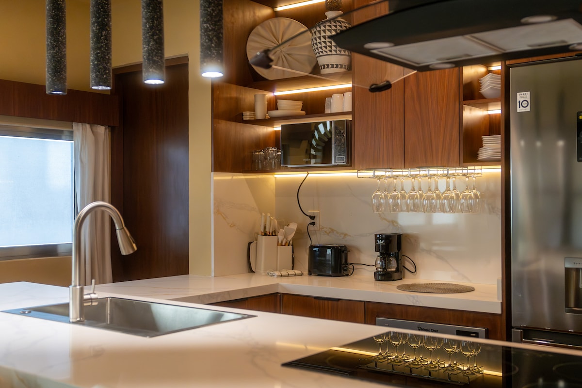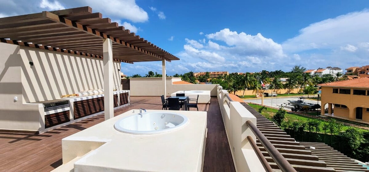 プエルト・アベントゥラスの高級マンションの1階にあり、家具が完備された専用テラスがあります。テラスから息をのむような海の景色と忘れられない夕日をお楽しみください。アパートには、キングサイズのベッドとクイーンサイズのベッド2台、快適なソファベッド、設備の整ったキッチン、ホテルスタイルの快適さ、毎日の清掃が備わっています。ラグーンからわずか数歩の場所に、グリル、ラウンジチェア、カヤック、パドルボードがあり、より充実した体験ができます。
