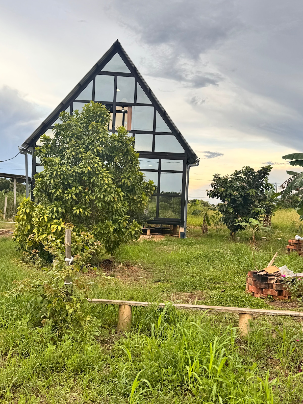 中心部の川を見下ろすキャノピーガラスバンガロー