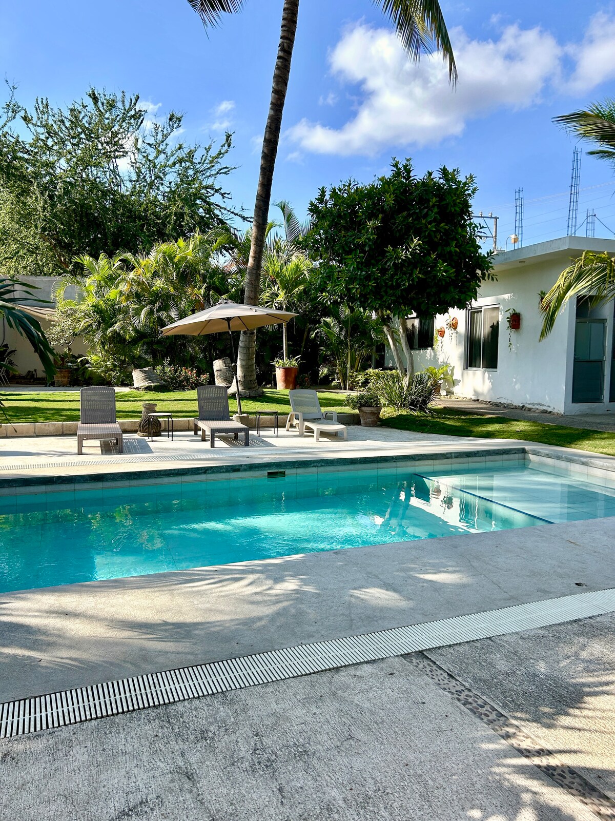 お得にリラックスできる1階のバンガローです。プールと大きな緑豊かな庭に直通の竹のテラスは、十分なスペースを追加します。専用駐車場が1台分あります。安全な場所にあり、高速インターネットを使って自宅から仕事ができます。Fluvialは、素晴らしいスーパー、カフェ、レストランがある高級住宅街です。ダウンタウン「マレコン」のナイトライフ、ラスグロリアスビーチ、クルーズターミナル、空港が近くにあります。リベラのアトラクションや地元のレストランへのアクセスが簡単なのもプラスです。ペット1匹はOKです。