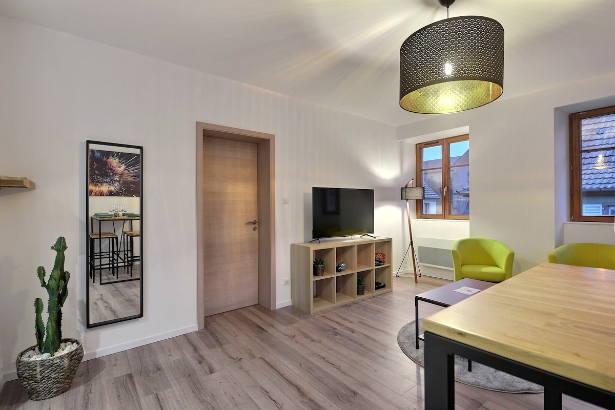 Cozy fully furnished studio in the heart of Guebwiller, located on the wine route. Enjoy tranquility and experience stunning vineyards and Vosges mountain views. Free parking nearby. Tastefully decorated, it's a short walk to restaurants, shops, and cultural spots. Explore natural trails, forests, and cycle paths right at your doorstep. An ideal base to explore Alsace - 25 minutes to Colmar, Mulhouse, and Markstein. Reach Strasbourg and Freiburg in about 1 hour, Basel/EuroAirport in 45 minutes.