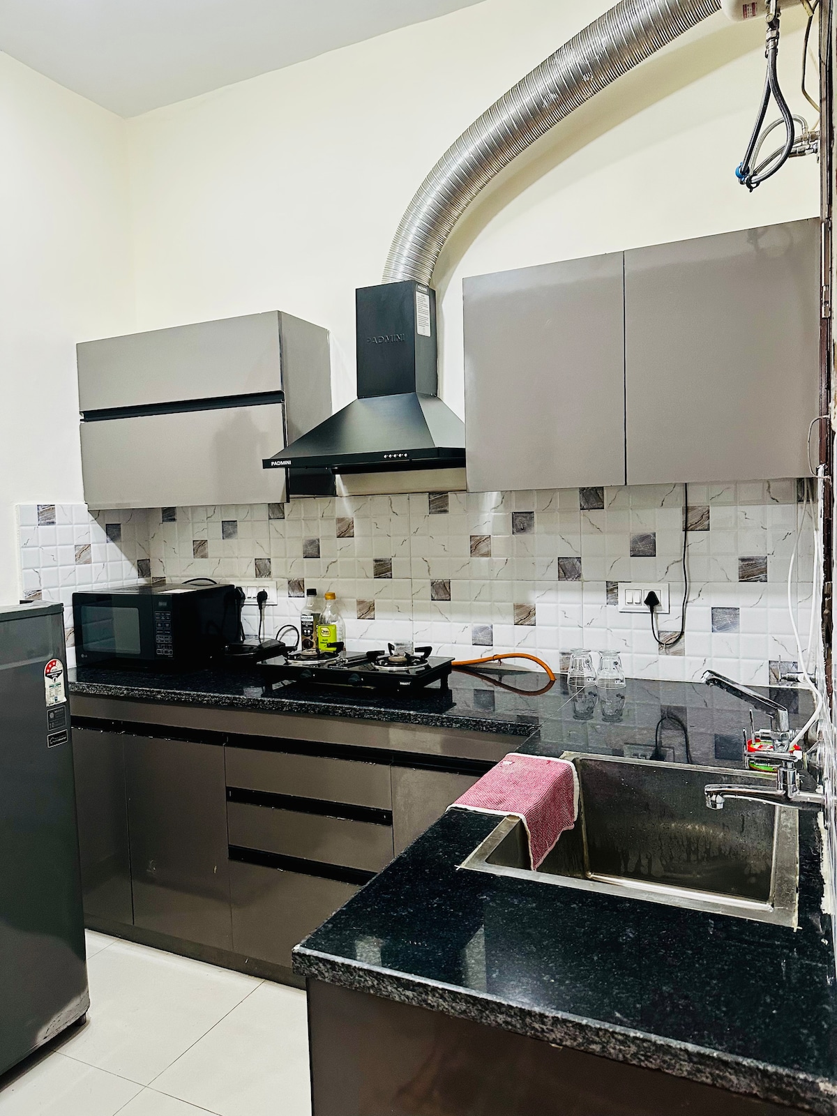 このオープンプランのワンルームアパートは、ミニマルなデザイン原則に従っています。 キッチン、バスルーム2室、フルサイズのキングベッド、クイーンサイズの壁ベッド、Netflix、Hotstar、PrimeVideo、JioCinema付きテレビ、無料Wi-Fiを備えたこのお部屋は、4人家族が快適に宿泊できます。 注意:こちらはオープンプランのアパートで、専用の寝室はありません。アパートは2階にあるため、2階分階段を上る必要があります。 パーティー禁止🙏🏽、喫煙禁止 🚭