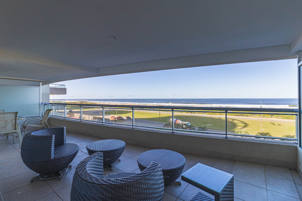 3 bedrooms & 4 bathrooms in the BEST BUILDING on the PENINSULA, directly across from the BEACH in Punta Del Este. 24-hr reception, 4-seasons swimming pool with sun deck, full gym & sauna. Private garage parking with direct home access, full kitchen, stacked washer/dryer, 4 Smart TVs with speedy streaming WiFi. Walls of windows overlook private patios & private grassy yard. Two king bedrooms + two twins in 3rd — all ensuite with Samsung Smart TVs. On the Rambla. Walk to restaurants and shopping.