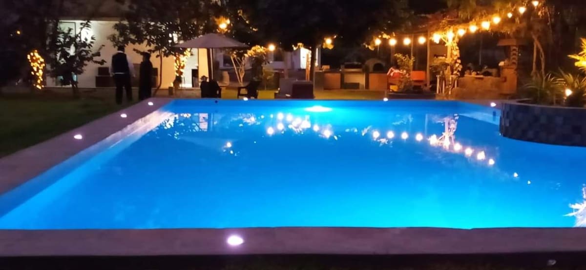 Predio de 3,600m2 con hospedaje hasta para 12 huéspedes, disfruta de una linda vista al jardín desde tu habitación, de día jugando en un extenso jardín de más de 2,400m2 jugando Sapo, fulbito de mano, Saltarín, nadando en una amplia piscina y opcionalmente Jacuzzi (*) o preparado una parrilla, por la noche con unos vinos calentándote frente a la fogata mientras los niños juegan con linternas o acampando con toda seguridad! (*) Servicio de Jacuzzi temperado tiene costo adicional