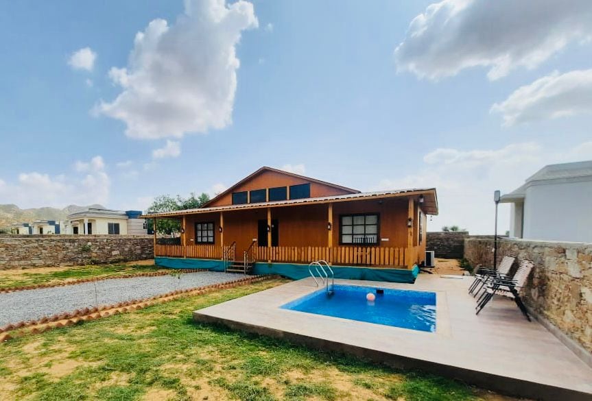 ネイチャーカルプヴィラは、自然の中にあるスイスの木造コテージを提供するユニークなファームステイで、プライベートプール、無料駐車場、24時間年中無休のレストランを備えています。アラバリの丘と緑に囲まれた田舎の完全装備コテージに滞在して、都会の喧騒から離れましょう。