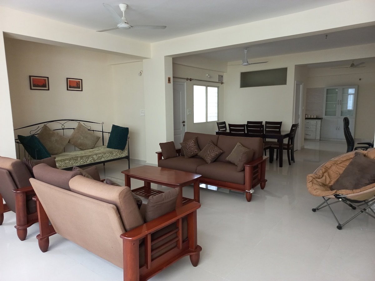 穏やかなチトラバーティ川の近くにあるプッタパルティの広々とした2BHKアパートへようこそ。 アシュラムまでは、風光明媚な散歩道を歩いて15分、または自動人力車ですぐに行くことができます。 アパートには設備の整ったキッチン、緑豊かな景色を望む広いバルコニー、プールとジムがあります。 高速Wi-Fi、エアコン付きの寝室、RO精製水、電源バックアップ、屋根付き駐車場、24時間警備をお楽しみください。 風通しの良いこの家は、美しい景色と穏やかな雰囲気を提供します。