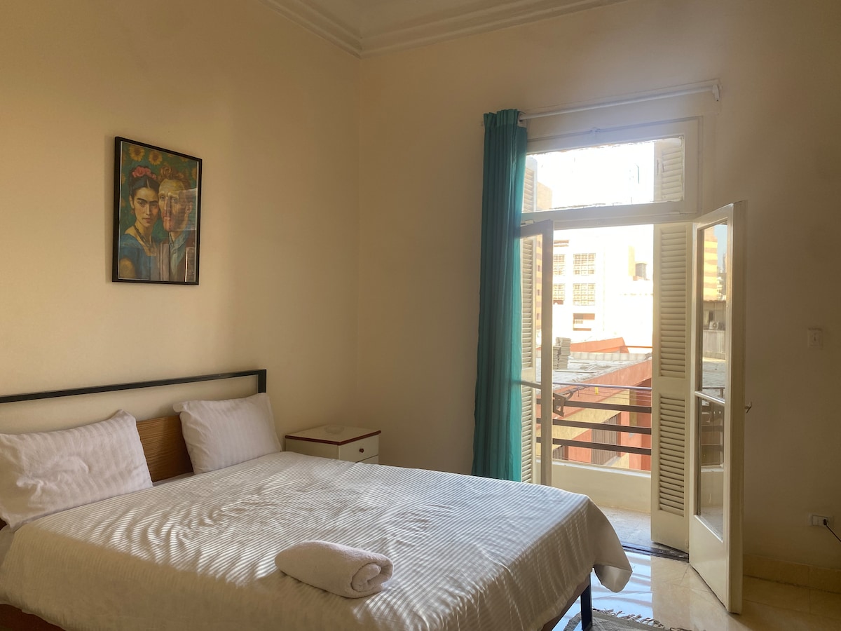カイロの中心部にある快適なプライベートスタジオをお楽しみください。市内で最も安全なエリアの1つにあります。バルコニーで美しい街の景色を眺めながらリラックスしたり、屋上のジャグジーで温水と冷水を楽しみながら、コーヒーや読書、夜のひとときを満喫してください。タハリール広場まで徒歩わずか15分、ナイル川まで10分、スーパーやあらゆる施設に近いです。このスタジオには、最大4名様まで宿泊可能な2台のベッドがあります。