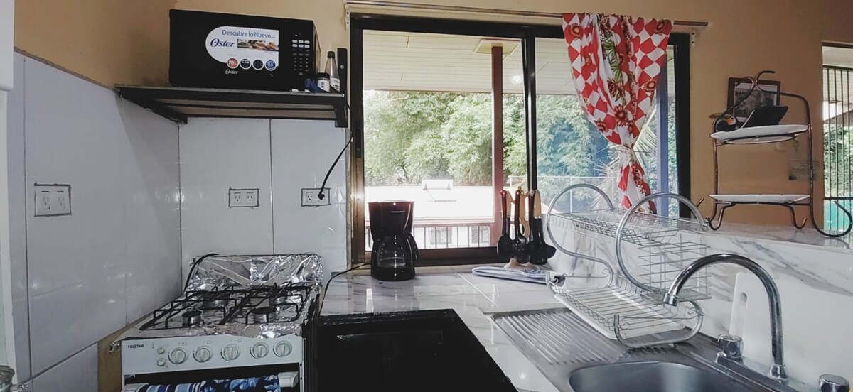 窓の外に広がる美しい野生動物の光景を見ながら目覚めることを夢見たことがありますか?そうであれば、ここは最適の場所です!...設備の整った家には、マヌエル・アントニオでのんびりとした休暇に必要なものがすべて揃っています。サルや鳥などの野生動物を見る絶好の機会です。1階に位置し、舗装された道路からアクセスできます。徒歩圏内にはバー、ショップ、レストラン、絶景のオーシャンビューがあります。ラ・マチャの隠れたビーチまでわずか0.8マイル、ケポスまでわずか6ブロックです。