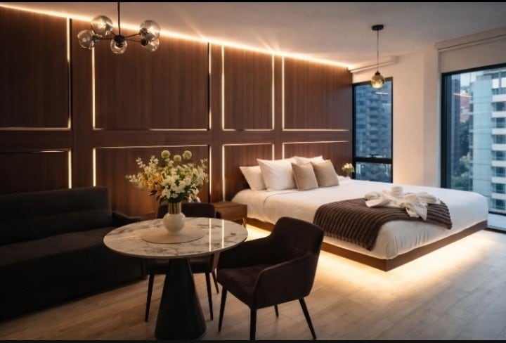 Edificio EDGE TOWER, piso 15 Disfrute de una experiencia de lujo en uno de los edificios más exclusivos de Quito. Este elegante departamento, ubicado en pisos altos, ofrece una vista espectacular de la ciudad, una ubicación inmejorable y un alto estándar de servicio. Para estadías prolongadas, incluimos sin costo adicional un servicio de limpieza profesional, garantizando siempre su comodidad y bienestar. *el área del spa está deshabilitado por cuestiones de mantenimiento profundo*