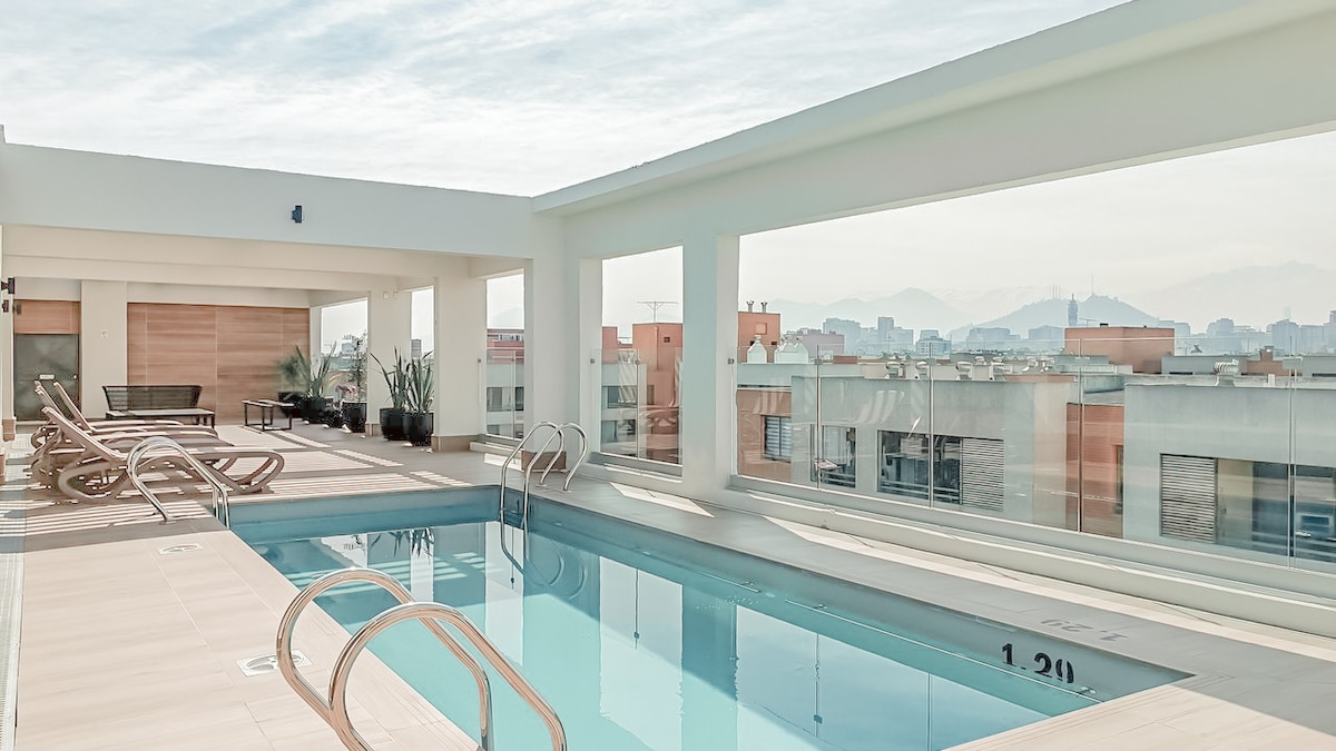 Disfruta, relájate y conoce Santiago. Departamento nuevo, full equipado ubicado en sector residencial a 7 min del Metro y a 1 cuadra del Estadio Nacional. Cuenta con 1 dormitorios y 1 baño, aire acondicionado, zona recreativa para niños, estacionamiento privado y seguridad 24/7; ideal para familia, matrimonios, parejas, amigos y aventureros. Alejado del ruido y a metros del Estadio Nacional.