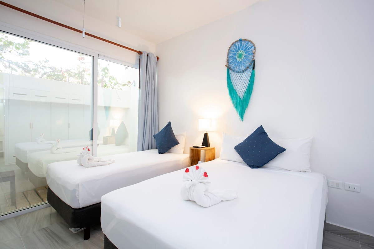 プラヤ・デル・カルメンの静かなエリアにあるワンルームスイートは、キングサイズベッド1台とシングルベッド1台(ご希望であればシングル3台にすることができます)を備えた3名様用のワンルームスイート。ミニキッチン、シーティングエリア、エアコン、Wi - Fi、DVDプレーヤー、毎日の基本的な清掃、ツアーなどがあります!