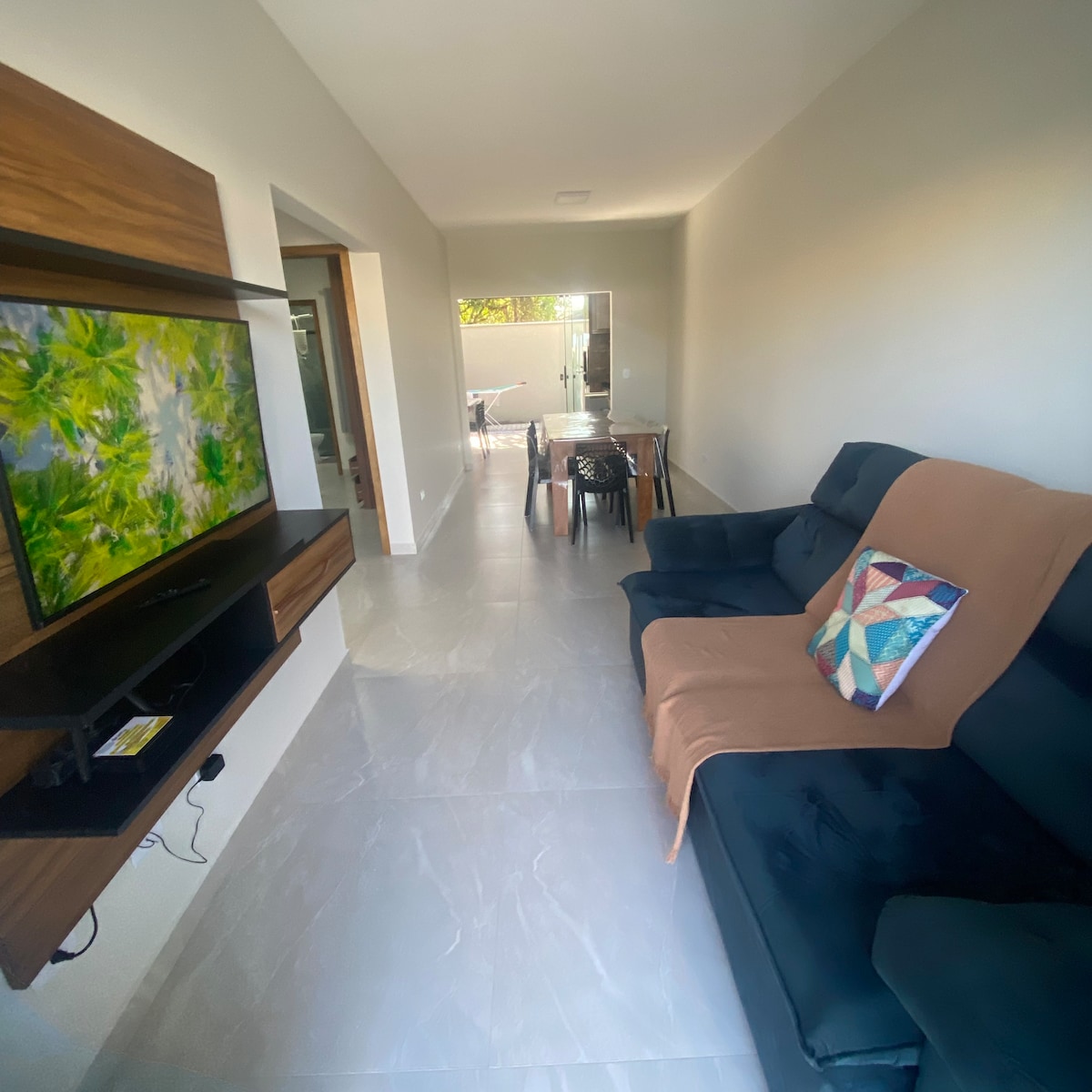 Linda casa recém-construída. A casa acomoda até 10 pessoas com conforto. Temos à disposição uma suíte com cama de casal, closet e equipada com um ar-condicionado, mais um quarto com 2 beliches e ar-condicionado e um terceiro quarto com 2 beliches e ventilador. A casa tem mais um segundo banheiro. A sala principal tem um pé direito alto com cozinha e sala de jantar anexas e mezanino. A área externa tem uma churrasqueira,duas redes. O pátio acomoda 2 carros. A praia fica em cerca de 300m.