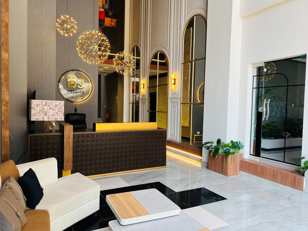 イスラマバード国際空港から車で12分の、スタイリッシュで快適な宿泊先へようこそ!このエレガントな1ベッドルームアパートは、出張者や豪華なお部屋を求めるゲストのために設計されており、快適さ、利便性、洗練された空間を提供しています。 アパートのハイライト: エレガントなリビングスペース – 現代的な家具、洗練されたダイニングエリア、長い1日の終わりにくつろぐための居心地の良いラウンジ。 高速Wi-Fi&スマートテレビ –高速インターネットとスマートテレビで接続して楽しみましょう。