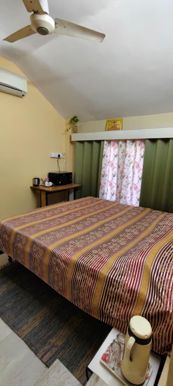 1階にある3つの寝室すべてが貸切で、すべてのアメニティが揃っており、自宅にいるような感覚を味わえます。明るく広々とした3つの寝室には家具が揃っており、リビングルームと付属のバスルームには24時間温水と冷水が供給されています。無料Wi-Fi、安全な駐車場、リラックスできる大きなテラスもあります。料金は、スイートルームバスルーム付きの3つのベッドルームのツインシェアベースの料金です。 必要に応じて、追加のベッドを1人600ルピーでご用意します ゲストはベジタリアンのインド料理を楽しむことができ、自分で料理することもできます。