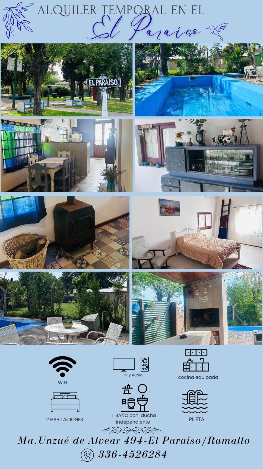 Equipado con cama matrimonial, Tv con DirectTV pregago opcional, sillones, cocina con horno a gas, heladera, microondas, tostadora y vajilla completa para 2 personas; baño completo con ducha.
