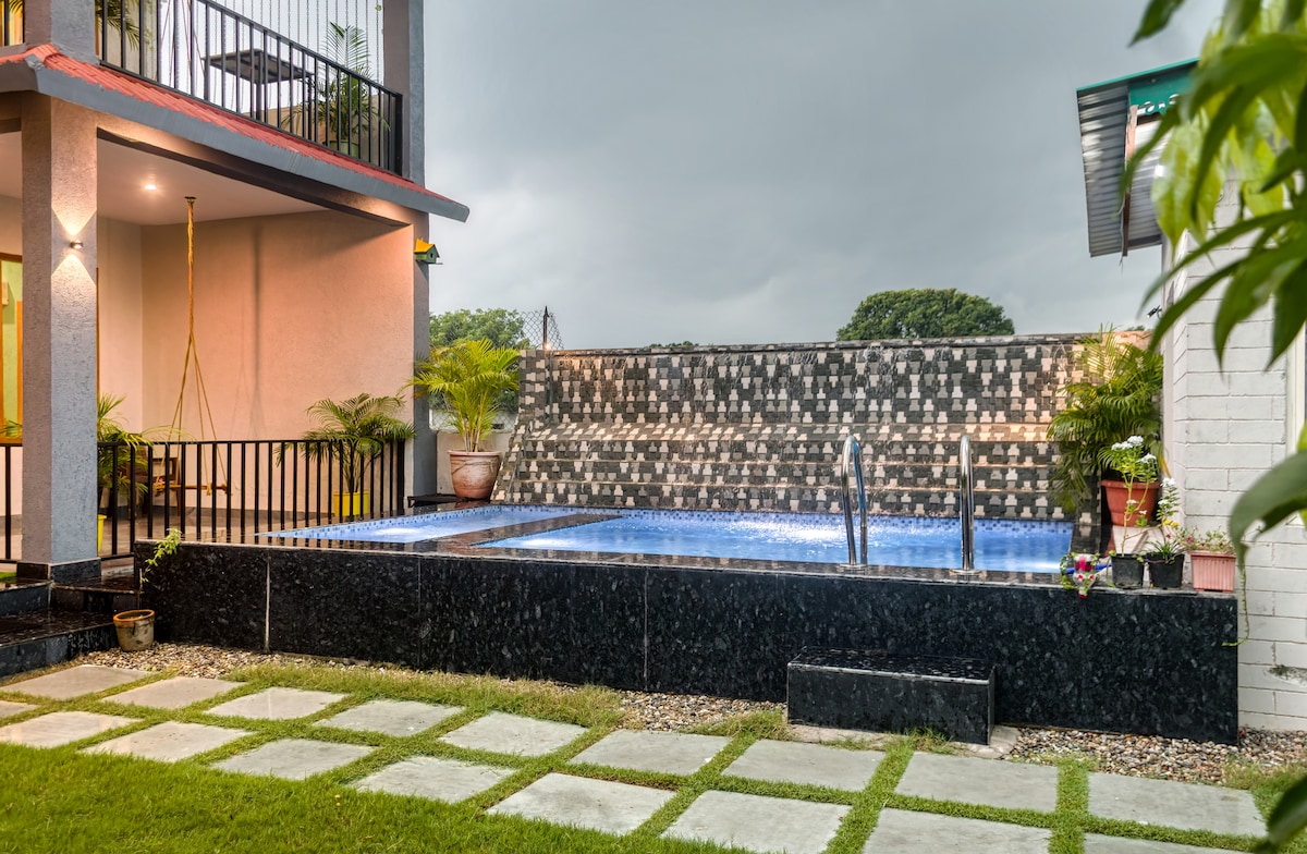For 2 adults and two kids. A two- storeyed, A shaped Glass- Wood- And- Stone studio villa amidst an Avocado canopy and a small Kiwi vineyard and quite a few rare flower plants in the premise of our ancestral property. Vinatge setting, a fireplace, a freshwater spring, many ponds, a hammock and the constant chirp of birds to keep you company. Ideal for trekkers, readers, bird wacthers, nature lovers, meditation practitioners or people just looking for a quiet spot in a forest.