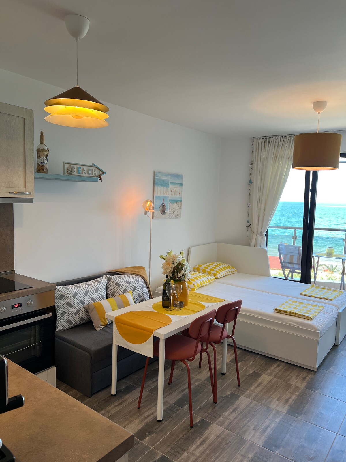 ビーチまで徒歩8歩のところにある、息をのむほど美しい海の眺めを楽しめる、真新しく居心地の良いアパートです。 すべてが近いです!癒しの柔らかい砂浜のビーチの最前列にあり、波の音が聞こえます サナトリウムまで徒歩2分、塩博物館まで徒歩5分、ブルガス市まで10 km、空港まで7 km。旧市街と中心街まで徒歩10分。目の前には観光列車の停留所があります。 バケーションを楽しむためのレストラン、お店、アトラクション、夏の映画館、新しいアクアパークがあります!
