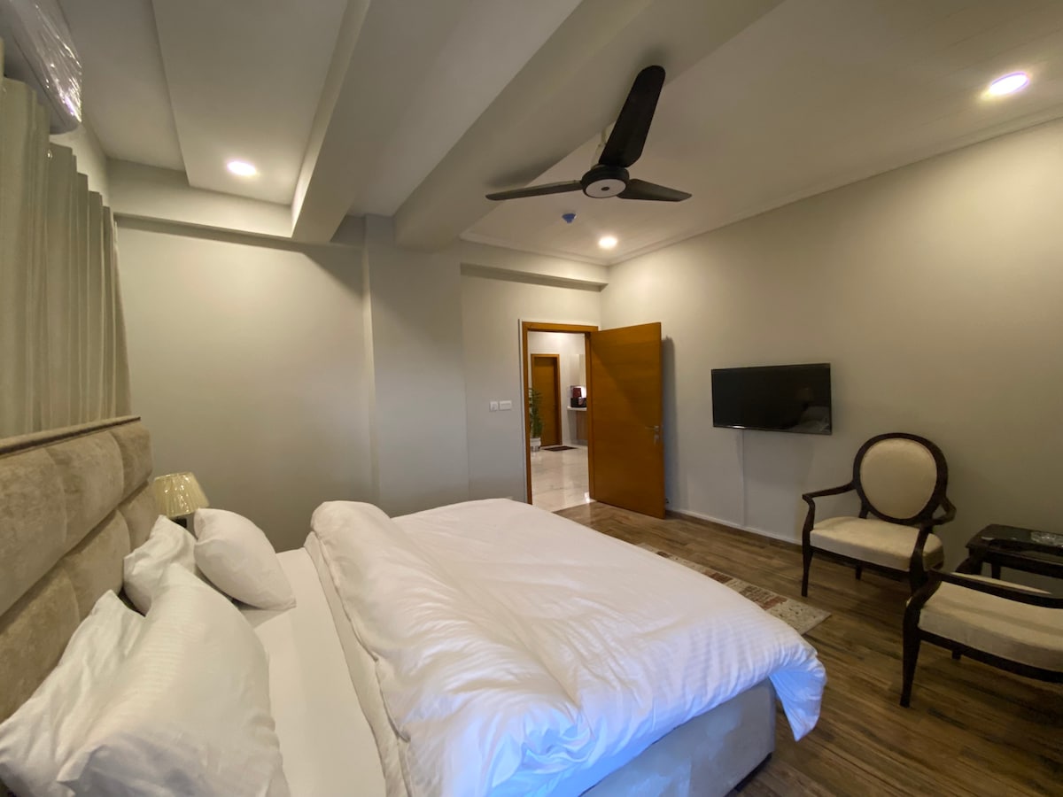 イスラマバードの中心部で自然に近い豪華な滞在をお探しなら、ここはぴったりです。 エレガントなAlexa対応スマートホーム内の景色の良い屋上レジデンスで、音声制御の照明と快適さを備えています。 専用玄関、広いテラス、キッチン、バスルーム、リビングルーム、55インチのスマートテレビ、暖房と冷房の両方ができるインバーターAC、途切れない高速Wi-Fi、Netflix、30種類以上のゲームが楽しめるXBOX-360を備えた完全プライベートな空間です。 朝食、ジャグジー(夏季)、サウナは追加料金でご利用いただけます。