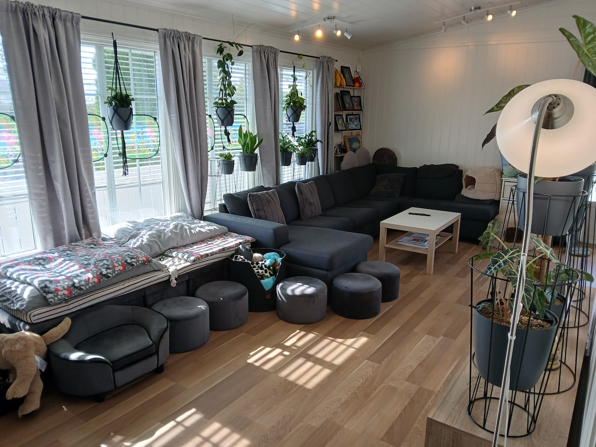 サウナ付きの魅力的なカントリーハウスで穏やかな日々をお楽しみください。サンドフィヨルド空港トープから20分です。ここでは、ドアのすぐ外にあるハイキングエリアで緑豊かな環境の中でリラックスできます。湖まで徒歩15分。カップルや家族連れに最適です(キングサイズベッド、リビングルームのロフトにベッド2台、リビングルームにベッド1台)。ゲームと子供用のおもちゃ。 サウナ、ベッドリネン、タオルが含まれています。長期レンタルには割引が適用されます。