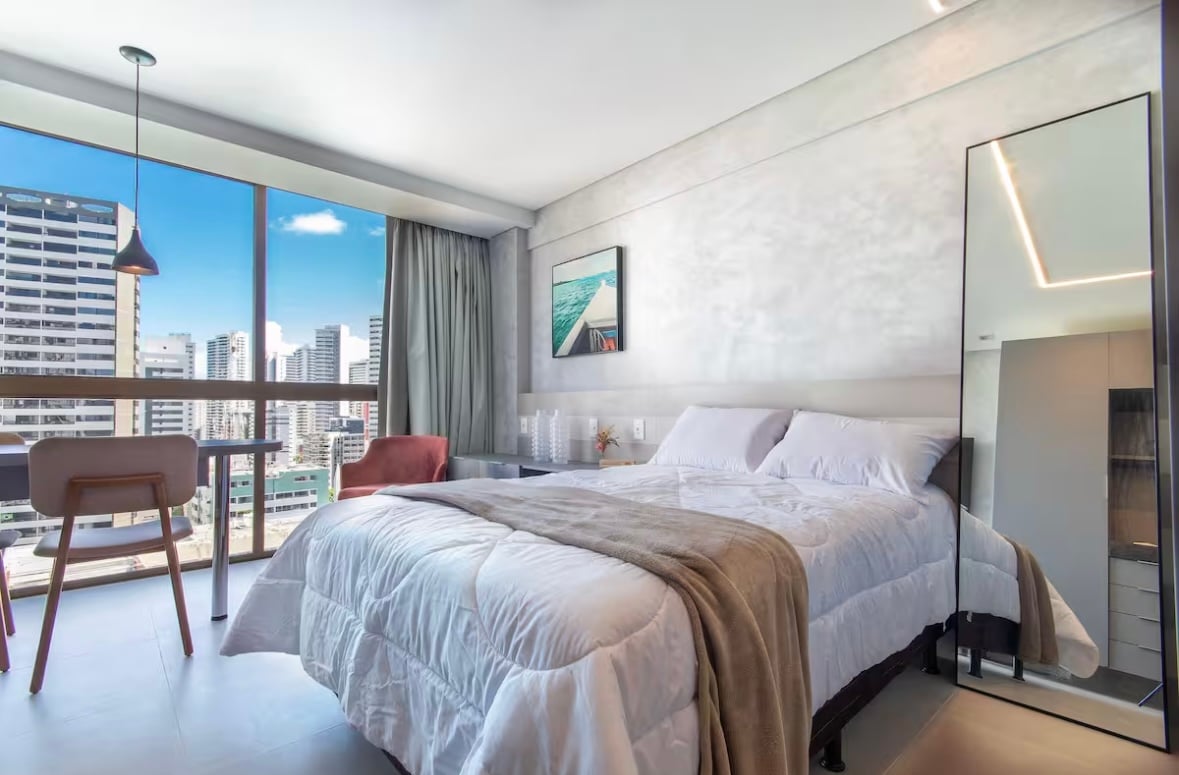 このユニークな場所には独自のスタイルがあります。 レシフェで働く人や数日楽しむ人に最適です。 ビーチ、主要ショッピングモール、レストラン、パン屋、カフェなどに近い、素晴らしいロケーションです。 当アパートには、快適なクイーンサイズベッドと補助ベッドが備わっています。 プレミアム寝具。 50インチテレビ。インターネット。 設備の整ったキッチン。食事や仕事に快適なテーブル。 駐車場、ランドリー、コワーキング、グルメスペース、プール、ジャグジー、ジムを備えたビル。