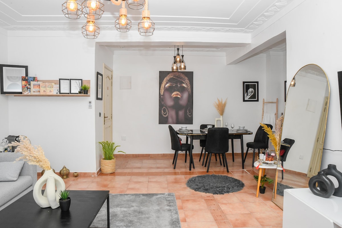 マラケシュの中心部に位置する2ベッドルーム、2バスルームのアパートでご滞在ください。高級シモンズの寝具、高速Wi-Fi(光ファイバー)、モダンな装飾、専用プールをお楽しみください。設備の整ったキッチン、エレガントなバスタブ、イタリアンシャワー。ジャマア・エル・フナ広場、プラザ、エデン広場から徒歩圏内です。 プールは温水ではありません。 注意:未婚のモロッコ人カップルは許可されていません。