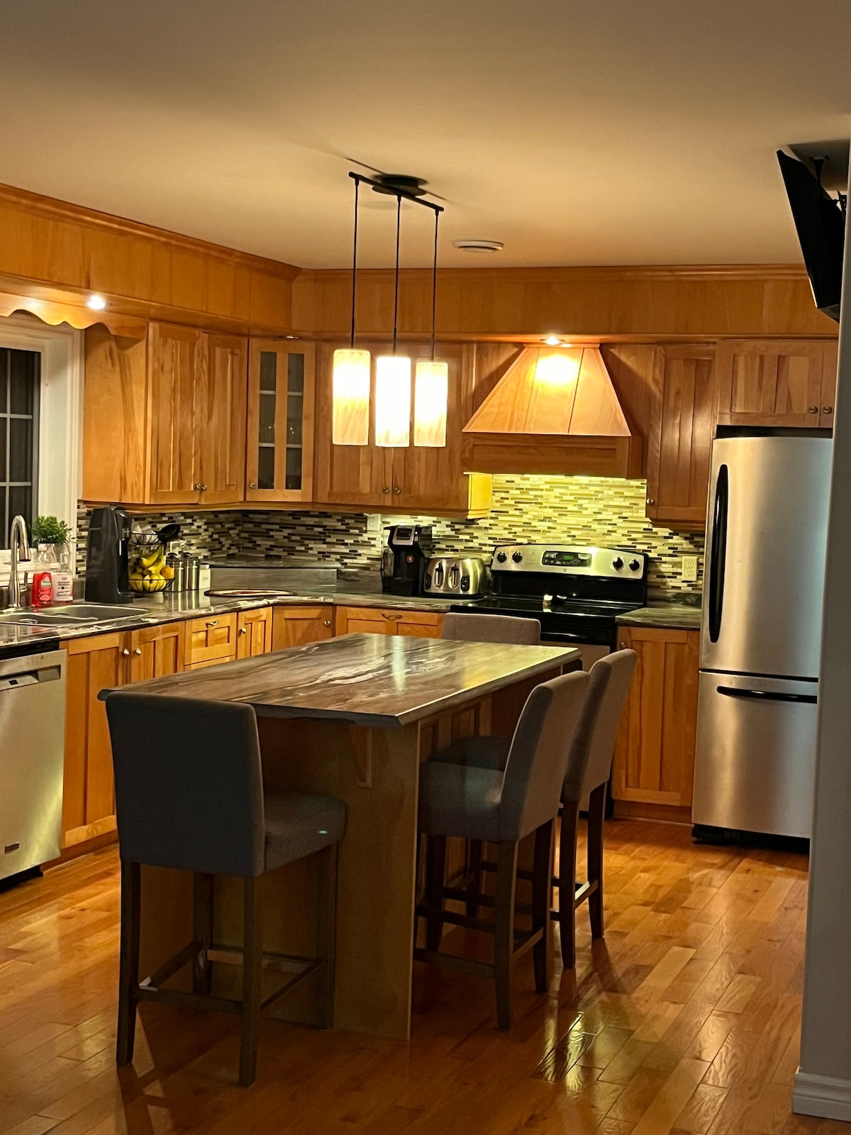 6人宿泊可能、とてもプライベート。空港まで5分、マーブルマウンテンとグロスモーンから40分、昆虫館とビーチから5分。家からスノーモービルコースにアクセスできます。設備の整ったキッチンとトイレ、洗濯機と乾燥機、専用デッキ、オフィスデスク、光ファイバーインターネット、Bell TV、遊び場があります。ロフトにはツインベッド2台、クイーンベッド1台、Bell TVがあります。下の階の寝室にはクイーンサイズベッドがあります。小さなお子様のためのパック&プレイ、本、おもちゃ。ロフトは、監督なしで小さなお子様には不向きです。