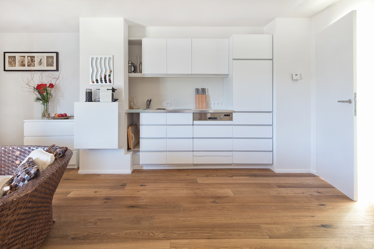 Our apartment is built in 2016 and we loved it to design the rooms, the equipment and the decoration. It´s based on the ground floor of our house and has an seperate entrance, an extra room for skies/hiking shoes, an extra entrance and a directly conecting to the terasse and the garden. The appartement is fully equipped and the overview to the beautiful mountains around you can enjoy sitting on the couch :) Just try and test the "homy" feeling in our house...