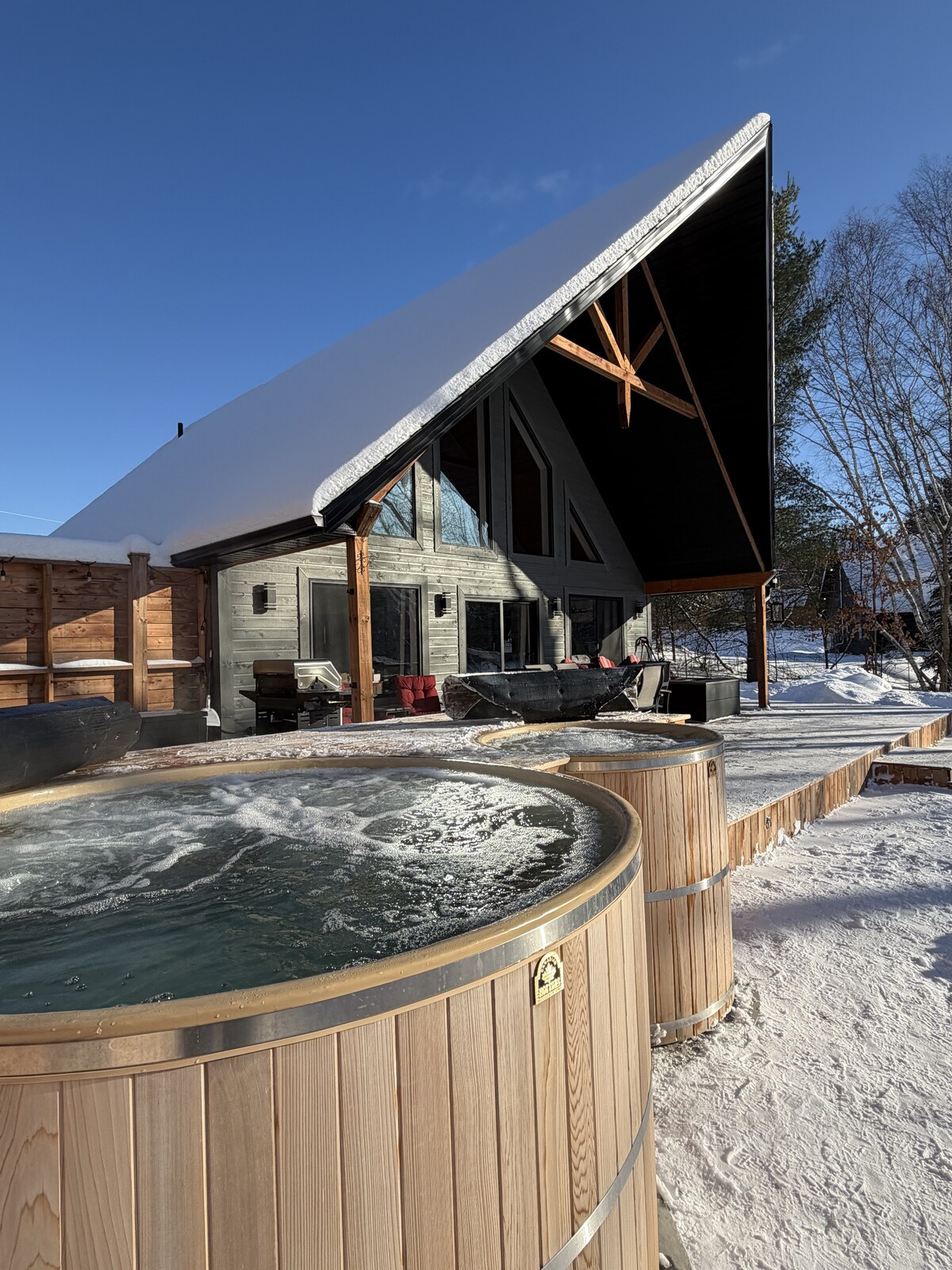 オタワからわずか1.5時間、トロントから4.5時間の場所にある、専用のノルディックスパを備えた豪華な4シーズン対応のリバーサイドシャレーです。 杉材のホットタブに浸かり、冷たいプランジでリセットし、室内の暖炉のそばで60インチテレビと映画館スタイルのサウンドシステムで映画の夜を楽しみましょう。寝室3室、バスルーム2室、高速Wi-Fi、2つのワークスペース、深いソーカーバスがあり、8人まで宿泊できます。 雪景色の川の眺めと暖炉のそばで過ごす夜、デッキサイドのプロパン火災とキャンプファイヤー、薪が用意されています。